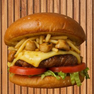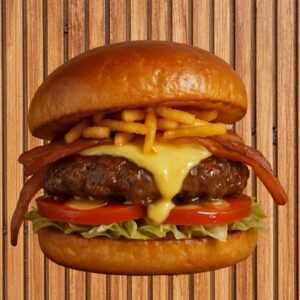 150Gr. de carne artesanal, queso derretido, aros de cebolla, ensalada, papitas al hilo, pan de hamburguesa.