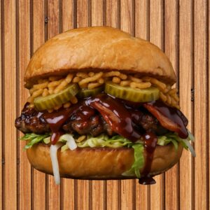 150Gr. de carne artesanal, tocino ahumado, palta en rodajas, papitas al hilo, pan de hamburguesa.